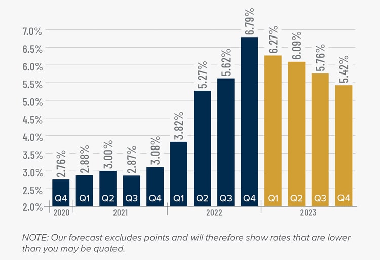 My current forecast is that mortgage rates will trend lower as we move through the year. While this may be good news for home buyers, rates will still be higher than they have become accustomed to. Even as the cost of borrowing falls, home prices in expensive markets will probably fall a bit more to compensate for rates that will likely hold above 6% until early summer.